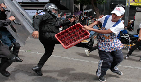 ▲ Seis trabajadores del gobierno capitalino y dos policías auxiliares resultaron lesionados en el zafarrancho entre ambulantes y elementos de la Secretaría de Seguridad Ciudadana local, cuando los uniformados intentaron replegar a los vendedores, que por segundo día consecutivo bloquearon Eje Central y avenida Juárez en demanda de espacios para expender su mercancía. Foto Germán Canseco. E. Bravo