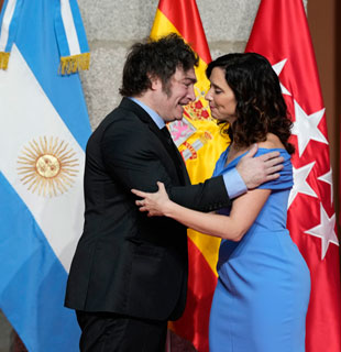 ▲ El mandatario de Argentina, Javier Milei, recibió la medalla internacional de la Comunidad de Madrid de manos de la derechista Isabel Díaz Ayuso. en su discurso, además de arremeter contra