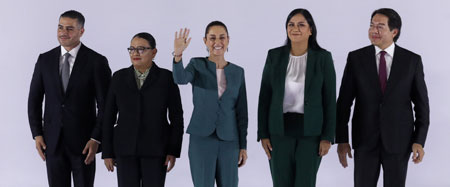 ▲ Claudia Sheinbaum Pardo, virtual presidenta electa, presentó ayer el tercer bloque de designados en su gabinete. la acompañaron Omar García Harfuch, Rosa Icela Rodríguez, Ariadna Montiel y Mario Delgado. Foto Marco Peláez
