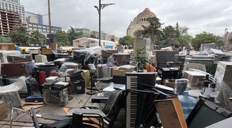 ▲ Instrumentos musicales y equipos electrónicos de audio y video fueron arrojados a la vía pública junto con mobiliario del Centro Universitario de Música Fermatta, cerca de la Plaza de la República, en la alcaldía Cuauhtémoc. La escuela fue desalojada en cumplimiento de una orden judicial. Luego del robo de equipos, los alumnos se organizaron para protegerlos. Foto Alfredo Domínguez De La Redacción