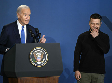 ▲ Durante los trabajos de la cumbre de la Organización del Tratado del Atlántico Norte en Washington, el presidente de Estados Unidos, Joe Biden, se equivocó al presentar a su par de Ucrania, Volodymir Zelensky (derecha), al llamarlo presidente Putin, aunque de inmediato corrigió. Poco antes nombró a Trump como su vicepresidente, cuando le preguntaron sobre Kamala Harris. Más tarde, durante una conferencia de prensa, el también candidato demócrata declaró: Soy la persona más calificada para derrotar a (Donald) Trump. Foto Afp / David Brooks y Jim Cason, corresponsales