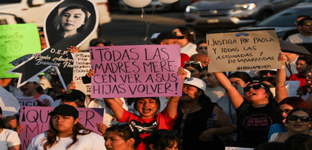 ▲ El Servicio Médico Forense informó que Paola Bañuelos murió de asfixia por estrangulamiento, mientras el chofer que conducía el auto de Didi, que abordó antes de desaparecer, llegó ayer al aeropuerto de Mexicali –procedente de Sonora, donde se entregó–, y fue trasladado a instalaciones de la fiscalía estatal. Agrupaciones, mujeres y sociedad en general se reunieron en el monumento a Benito Juárez, sobre la avenida Justo Sierra, para exigir justicia por el feminicidio de la joven, cuyo cuerpo fue localizado el jueves en un predio del ejido Islas Agrarias, en la periferia de la ciudad fronteriza. Foto Cuartoscuro. Juan M. Yepiz y Mirella Cuéllar / La Jornada Baja California