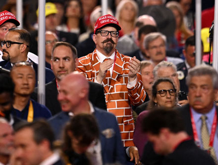 ▲ Uno de los participantes en la Convención Nacional Republicana, en Milwaukee, se vistió con un traje con imágenes de ladrillos para promover la construcción del muro fronterizo de Donald Trump. Entre los temas del segundo día del encuentro estuvieron restablecer la seguridad en casa y en el extranjero, así como hacer ‘‘América grande otra vez’’. Foto Afp