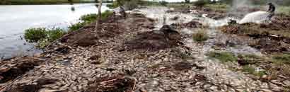 ▲ Pobladores de Juanacatlán, en Jalisco, han impedido la entrada de maquinaria para retirar los especímenes, cuya muerte masiva se reportó desde el pasado fin de semana por causas aún desconocidas. Aunque se cree que pudo deberse al escurrimiento de agroquímicos, será la secretaría de Salud local la que emita un dictamen final. Foto Afp / Juan Carlos G. Partida, corresponsal