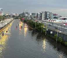 ▲ La fuerte lluvia que azotó ayer el norte y el oriente de la capital provocó inundaciones en calles y avenidas de hasta 20 centímetros de altura, así como caída de árboles, uno de los cuales se desplomó en las vías del tramo jamaica-Fray servando de la línea 4 del Metro y provocó la suspensión del servicio. En la imagen, la anegación en Circuito Interior, en las inmediaciones del AICM. Foto Víctor Camacho / Hayelli