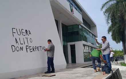 ▲ Protesta contra el dirigente nacional priísta en Campeche. Foto Joaquín Vargas