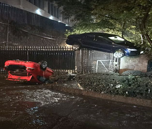 ▲ Tras la tormenta de ayer en el surponiente, en la colonia Atlamaya, alcaldía Álvaro Obregón, un vehículo quedó atorado en una reja y otro se volcó, debido al torrente que se formó en la zona. Se registraron inundaciones en vialidades como Periférico, Insurgentes, Revolución, Barranca del Muerto y Mixcoac, algunas incluso se volvieron intransitables. Foto tomada de redes sociales De La Redacción
