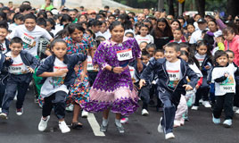 ◀ El Sistema Nacional para el Desarrollo Integral de la Familia invitó ayer a las deportistas rarámuris Lorena Ramírez, Anaís Fuentes y Cristina Parra a la carrera Vamos Juntas y Juntos hacia la Meta, del Ángel de la Independencia al Monumento a la Revolución. Foto María Luisa Severiano.