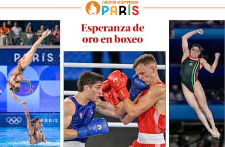 ▲ Marco Verde (centro) selló su pase a la final de boxeo al vencer al británico Lewis Richardson, categoría 71 kilogramos, para buscar el campeonato el viernes contra el uzbeko Asadkhuja Muydinkhujaev. A la izquierda, la selección de natación artística brilló en su rutina libre ayer y, a la derecha, la clavadista Alejandra Orozco cerró su participación en el octavo lugar de plataforma y puso fin a su exitosa carrera, en la que logró dos preseas, en Londres 2012 y Tokio 2020. Fotos Afp, COM_México y Ap / Redacción