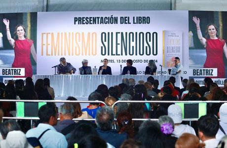▲ El Zócalo fue el escenario en el que la escritora y esposa del presidente Andrés Manuel López Obrador, quien acudió como oyente, presentó ayer su más reciente libro, Feminismo silencioso, acompañada, entre otros, de la embajadora en Ecuador, Raquel Serur, y la gobernadora del estado de México, Delfina Gómez, así como del periodista Pedro Miguel, quien destacó el papel de Gutiérrez Müller en la abolición de la figura de la primera dama. Al final no hubo firmas para no dar lata a la policía. Foto Luis Castillo / A. Cano y A. Vargas