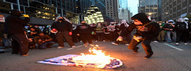 ▲ Mientras el cónclave transcurría en su segunda jornada, afuera continuaron las manifestaciones contra el apoyo de Estados Unidos a Israel y en demanda de un alto el fuego en Gaza. Foto Afp