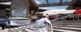 ▲ Trabajador del Poder Judicial se manifiesta en el Palacio de Justicia de San Lázaro. Foto Jorge Pablo García. Reporteros y Corresponsales