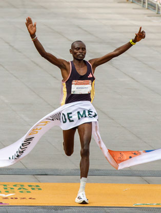 ▲ La edición 41 de la competencia culminó con tres corredores de Kenia en el podio: Edwin Kiprop Kiptoo (en la imagen, quien repitió su triunfo de 2022), Leonard Langat y Francis Cheruiyot. Participaron 30 mil corredores, 500 de ellos extranjeros. El mejor mexicano fue Tomás Luna, quien llegó en noveno lugar. La ruta de 42.195 kilómetros partió de Ciudad Universitaria y la meta fue en el Zócalo. Foto Pablo Ramos. Adriana Díaz y Joshua Reyes