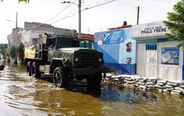 ◀ A 25 días de la inundación, el nivel del agua en las colonias Jacalones y Culturas de México volvió a subir tras las lluvias del fin de semana pasado. Aunque no hay datos oficiales, vecinos calculan que la mitad de las viviendas ya están deshabitadas. En protesta, cerraron ayer la avenida Solidaridad. Foto e información de