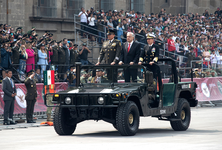▲ Como parte de los festejos patrios, ayer se celebró el desfile cívicomilitar por el 214 aniversario del inicio de la gesta de Independencia. Participaron 15 mil 688 soldados, marinos e integrantes de la Guardia Nacional, que fue la encargada de abrir el recorrido con todas sus compañías. También, como es tradición, hubo 92 aeronaves dentro del programa. Las autoridades de la Ciudad de México reportaron la asistencia de 120 mil personas y saldo blanco. En la imagen, el general Luis Cresencio Sandoval y el almirante José Rafael Ojeda Durán flanquean al presidente Andrés Manuel López Obrador. Foto María Luisa Severiano