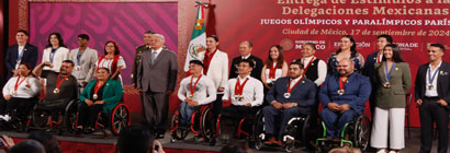 No se den por vencidos nunca, aconsejó el presidente Andrés Manuel López Obrador a deportistas que compitieron en las ediciones de París 2024, al entregar ayer estímulos, en total 78 millones 240 mil pesos, repartidos entre 109 atletas convencionales y 67 adaptados. Los ganadores de oro recibieron 3 millones, los de plata 2 y de bronce un millón. A todos los participantes se les otorgaron 240 mil pesos. Foto Germán Canseco / Adriana Díaz