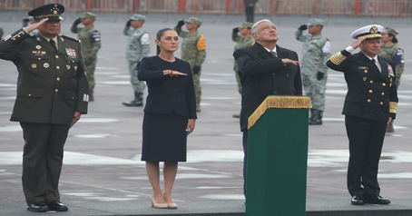 ▲ Acompañados por los secretarios de la Defensa y la Marina, Luis Cresencio Sandoval y José Rafael Ojeda, el presidente Andrés Manuel López Obrador y su próxima sucesora, Claudia Sheinbaum, encabezaron ayer por la mañana la ceremonia del izamiento a media asta de la bandera en el Zócalo con el fin de honrar la memoria de los caídos en los terremotos de 1985 y 2017, ambos ocurridos un 19 de septiembre. Integrantes del Ejército ejecutaron el toque de silencio y al final se entonó el Himno Nacional. Foto José Antonio López. Rocío González
