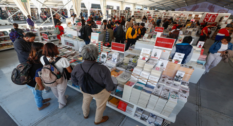 ▲ La edición 24 de la Feria Internacional del Libro (FIL) en el Zócalo de la Ciudad de México comenzó ayer con un anuncio que promete llevar la lectura a cada rincón de la capital, ya que el Fondo de Cultura Económica abrirá librerías en las 100 Utopías que el gobierno local proyecta construir en este sexenio. En la plaza central participan este año 327 editoriales y habrá 269 actividades, como presentación de libros, charlas, música y encuentros comunitarios hasta el 20 de octubre. Foto Víctor Camacho. Daniel López Aguilar