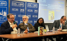 ◀ Con el propósito de que nos conozcan más en el extranjero para que nos entiendan mejor, el rector de la UNAM, Leonardo Lomelí (izquierda), presentó su libro Estado, economía y sociedad en el México posrevolucionario, en la Feria Internacional del Libro de la Ciudad de Nueva York. A su lado, el embajador en la ONU, Héctor Vasconcelos, señaló que en el volumen halla paralelos contemporáneos. La sexta edición del encuentro impulsó la literatura latina. Foto La Jornada