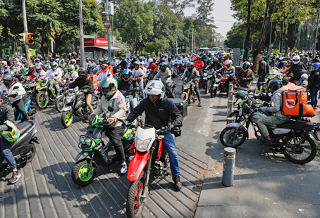 ▲ Repartidores de comida realizaron una rodada motociclista del parque La Bombilla a la Secretaría del Trabajo y Previsión Social, ubicada en Periférico Sur, para conocer la reforma de ley que regulará a los trabajadores por aplicación. La presidenta Claudia Sheinbaum anunció en su conferencia matutina que enviará al Congreso una propuesta laboral para apoyarlos. En una reunión, autoridades aseguraron que habrá mesas de diálogo para abordar y elaborar el contenido. Foto Jorge Ángel Pablo García. César Arellano