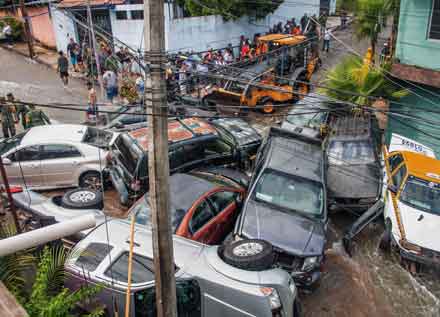 ▲ La fuerte precipitación ocasionada por el frente frío número 4, que azotó la noche del miércoles y madrugada del jueves a la zona metropolitana de Monterrey, provocó severas inundaciones en el municipio de Guadalupe por el desbordamiento de una represa localizada en las laderas del cerro de la silla. La corriente arrastró al menos 13 vehículos hasta hacerlos chocar entre sí (en la imagen). También se reportaron afectaciones en la capital del estado y otras cuatro localidades. Foto Afp / Raúl Robledo, corresponsal