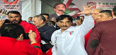 ▲ Durante los festejos por el Día del Ferrocarrilero, el octogenario Víctor Flores, quien cumplirá 36 años como dirigente del gremio, agradeció la unidad y la lealtad a un servidor. Ataviados con gorras y playeras rojas, los trabajadores y sus familias degustaron una taquiza y fueron agasajados con un mariachi, el espectáculo del comediante Platanito Show y la obra teatral Aventurera. Foto Jared Laureles