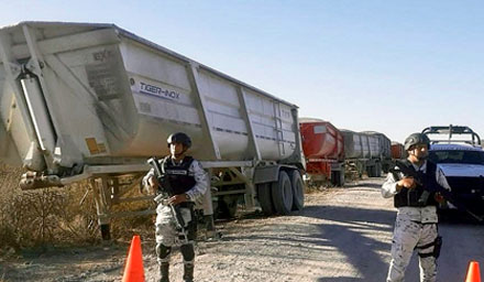 ▲ Efectivos de la Guardia Nacional localizaron ayer en Victoria, Durango, nueve de 11 góndolas que fueron robadas en Zacatecas el pasado 31 de octubre a la minera Peñasquito, propiedad de la firma estadunidense Newmont, aunque la carga, de 285 toneladas de concentrado de minerales, con valor de 3 mdd, sigue desaparecida. Foto La Jornada / A. Valadez y S. Maldonado, corresponsales