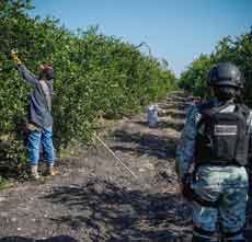 ▲ La Defensa vigila con 860 efectivos seis municipios de Michoacán asolados por la extorsión a productores y comercializadores del cítrico. Han detenido a 63 presuntos delincuentes y decomisado armas y drogas. A dos meses del operativo, trabajadores señalan que se encuentran más tranquilos. Foto Cristina Rodríguez / C. Arellano