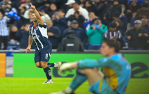 ◀ Los Rayados apabullaron 5-1 (global 6-3) al San Luis y esperan al ganador de la llave Cruz Azul contra América. En la imagen, el español Óliver Torres festeja uno de sus dos goles en el Gigante de Acero. Foto Afp