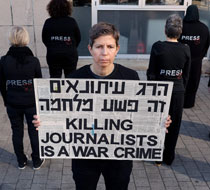 ◀ Israel continuó los bombardeos sobre Gaza, con saldo de 61 muertos, entre ellos decenas de mujeres y niños, así como el periodista Omar Al- Derawi, a quien rindieron homenaje colocando su chaleco de prensa sobre su sudario. La Autoridad Nacional Palestina detuvo temporalmente las emisiones de Al Jazeera, suspendió sus actividades y cerró sus oficinas en Cisjordania. En la imagen, protesta en Tel Aviv por el asesinato de reporteros. Foto Afp / Agencias