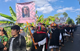 ◀ En una peregrinación en el municipio de Chenalhó, cientos de personas recordaron al sacerdote tsotsil asesinado en octubre pasado. También pidieron el retorno seguro de habitantes desplazados y que los grupos criminales sean desarmados y desarticulados. Foto La Jornada