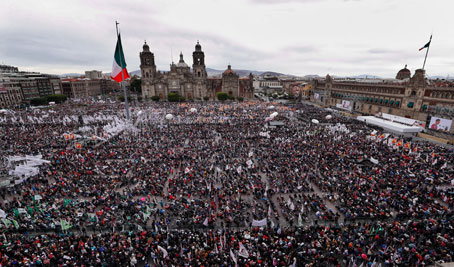 ▲ Miles de personas de varios estados se dieron cita en el Centro Histórico para presenciar el mensaje de la presidenta Claudia Sheinbaum, donde hizo un balance de los logros económicos, sociales, educativos, en seguridad e infraestructura del año pasado, y en particular del arranque de su administración. Aseguró que se mantendrá el humanismo mexicano y que aquellos que desean que traicione al pueblo