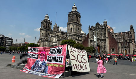 ▲ Tras llegar en caravana desde Oaxaca, integrantes de la Alianza de Pueblos por la Justicia Social instalaron un plantón frente a Palacio Nacional para solicitar que la presidenta Claudia Sheinbaum intervenga ante la cerrazón del gobernador Salomón Jara para atender los casos de agresiones contra activistas, feminicidios y represión. Acordaron con la Secretaría de Gobernación gestionar una mesa de diálogo con el mandatario, la fiscalía estatal y la delegación de la FGR en la entidad. Foto Alfredo Domínguez / J. Xantomila y J. Laureles