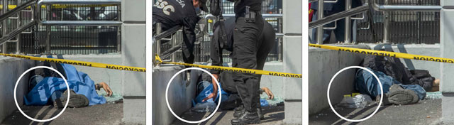 ▲ Antes de la llegada de peritos y tras acordonar el lugar, se ve la intervención de agentes en el sitio donde quedó tendido el cuerpo de un hombre después de que, de acuerdo con las autoridades, los uniformados impidieron