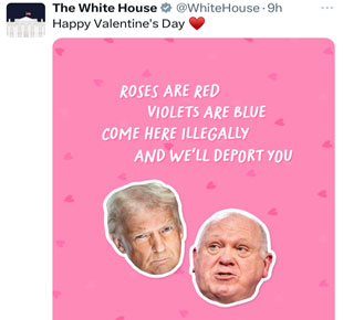 Las rosas son rojas, las violetas son azules, si vienes ilegalmente, te vamos a deportar, fue el mensaje que la Casa Blanca difundió en su cuenta de X este 14 de febrero, con una imagen de la cara de Donald Trump y de su zar fronterizo, Tom Homan, a manera de tarjeta de regalo. / Ap