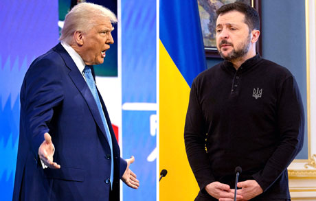 ▲ El magnate señaló ayer que un comediante modestamente exitoso, Volodimyr Zelensky, convenció a Estados Unidos de gastar 350 mil millones de dólares para entrar en una guerra que nunca debió comenzar. En imágenes de ayer, el republicano durante la cumbre Iniciativa de Inversiones Futuras en Miami, Florida. A la derecha, el presidente ucranio durante una conferencia en Kiev. Fotos Afp