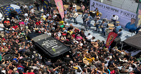 ▲ En un homenaje póstumo, la urna con las cenizas de la cantante hizo un recorrido que partió de una funeraria de la calle de General Prim, con escala en Garibaldi, el mercado Martínez de la Torre y finalizó en Casa Paquita, su restaurante-bar, ambos en la colonia Guerrero, donde sus admiradores entonaron temas que la intérprete veracruzana convirtió en éxitos, como Rata de dos patas, Cheque en blanco y Tres veces te engañé. Foto Alfredo Domínguez. Ángel Vargas y Jorge Caballero