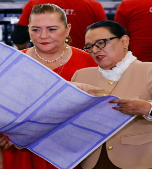 ▲ Al comenzar la producción de 602 millones de boletas en Talleres Gráficos de México para la elección de jueces, ministros y magistrados, la secretaria de Gobernación, Rosa Icela Rodríguez (a la derecha), confió en que esos comicios serán exitosos y significarán un avance en el sistema de justicia. Junto con Guadalupe Taddei, titular del INE, supervisó los primeros trabajos de impresión. Foto Germán Canseco. Fabiola Martínez