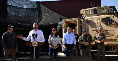 ▲ En su visita ayer a la frontera, en Eagle Pass, Texas, acompañado del secretario de Defensa, Pete Hegseth (izquierda), y de la directora de Inteligencia, Tulsi Gabbard, el vicepresidente estadunidense volvió a amagar con el uso de sus fuerzas armadas contra los traficantes mexicanos. Foto Ap