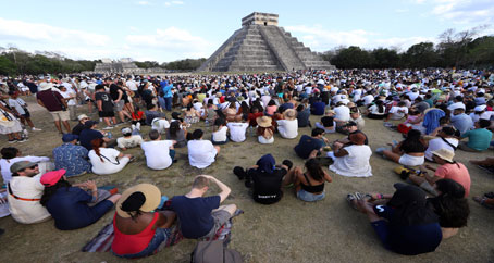 ▲ Entre el eco de caracoles, danzas y ceremonias, miles de personas se reunieron ayer en las principales zonas patrimoniales del país para dar la bienvenida a la primavera. Este año se mantuvo la restricción de acceso a la cima de las pirámides, como parte del Operativo Equinoccio de Primavera 2025 del INAH. En Chichen Itzá (imagen), más de 9 mil personas presenciaron el descenso de Kukulcán, cuando la luz y la sombra proyectaron la fi gura de la serpiente emplumada en la escalinata de El Castillo. Foto Ap. Corresponsales