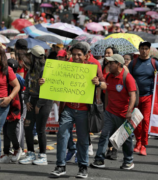 ▲ Con una marcha masiva en la capital del país, así como movilizaciones en Chiapas, Chihuahua, Tamaulipas, Michoacán, Quintana Roo y Yucatán, miles de profesores de la CNTE concluyeron ayer el paro nacional de 72 horas. En la Plaza de la Constitución, los dirigentes advirtieron que la nueva primavera magisterial va a continuar y que su objetivo principal es la abrogación de la Ley del Issste 2007. Foto Jair Cabrera / Laura Poy y corresponsales