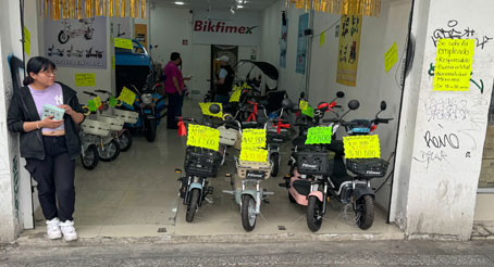 ▲ En calles del primer cuadro de la Ciudad de México se venden bicicletas eléctricas, scooters y motos sin restricciones. Entre los beneficios ofrecidos por los locatarios se encuentran que no requieren placas, permiso de circulación ni licencia, y también expenden las refacciones. Los precios de estos artículos, principalmente de producción china, van de 7 mil 800 a 23 mil pesos. En su mayor parte son adquiridos, a decir de los trabajadores de los negocios, por comerciantes y amas de casa. Foto Víctor Camacho. Elba Mónica Bravo