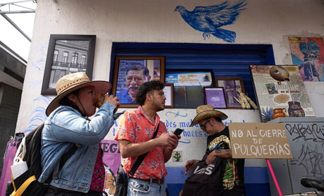 ▲ Productores de la bebida espirituosa, músicos, artistas gráficos y artesanos, entre otros, se manifestaron ayer contra el cierre de una decena de pulquerías en lo que va de este año. Entre sus demandas está declarar estos establecimientos como Patrimonio Cultural Inmaterial de la CDMX. En la imagen, La Paloma Azul, uno de los expendios suspendidos. Foto Cuartoscuro / A. Flores y B. T. Ramírez