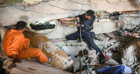 ▲ Apenas unas horas después del terremoto que golpeó a esa nación asiática con saldo parcial de mil 644 fallecidos, 3 mil 408 heridos y cientos de desaparecidos, la junta militar gobernante reanudó los bombardeos en zonas controladas por rebeldes, pese a estar también entre las áreas más dañadas. En la imagen, grupos de rescate intentan liberar a una persona atrapada bajo los escombros de un complejo de departamentos en Mandalay, donde se cree que aún permanecen unos 90 residentes. Foto Afp. Agencias