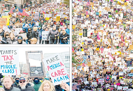 ▲ Cientos de miles se manifestaron en Washington y todo Estados Unidos contra el presidente Donald Trump y su aliado Elon Musk por despedir a miles de trabajadores federales, deportar a migrantes, reducir la protección a personas transgénero y recortar programas de salud. Las protestas forman parte del movimiento Manos fuera. Las imágenes de la izquierda corresponden a Nueva York (arriba) y Denver, Colorado; la de la derecha, a Los Ángeles, California. Fotos Afp