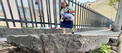 ▲ Aceras desniveladas, bloques de cemento descuadrados, levantados, fisurados, en terracería y con huecos es el escenario urbano que enfrentan los habitantes de la capital, con riesgo de caer y sufrir lesiones graves. Foto Roberto García Ortiz / Josefina Quintero