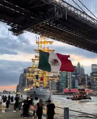 ▲ Un video tomado cuando ocurrió la colisión muestra el momento del impacto de los tres mástiles contra la base del puente de Brooklyn, uno de los símbolos de la ciudad de Nueva York. Imagen de una captura de video