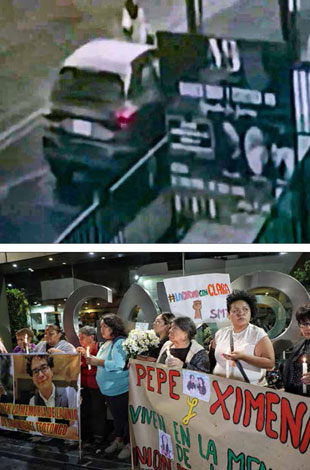 ▲ El ataque a los colaboradores de la jefa de Gobierno ocurrió alrededor de las 7:15 horas de ayer, cuando su secretaria particular, Ximena Guzmán, aguardaba en su auto la llegada de José Muñoz sobre calzada de Tlalpan, dirección Zócalo, cerca del Metro Xola, para ir al trabajo. Un sujeto con casco disparó primero contra ella y alcanzó luego al asesor. Agentes localizaron una camioneta y una moto presuntamente usadas en el crimen. Arriba, imagen de una cámara de video; abajo, el velorio, anoche. Fotos redes sociales y Jair Cabrera