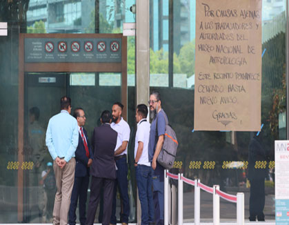 ◀ En Antropología apareció un cartel escrito a mano en el que se deslinda a trabajadores y autoridades del recinto. Foto Luis Castillo