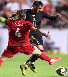 ▲ Lo sucedido en el estadio de la Universidad de California del Norte, más de la mitad vacío, pone en duda el éxito en taquilla de la Copa Oro, que comienza el sábado. En la imagen, Santi Giménez busca eludir al turco Caglar. Foto Afp